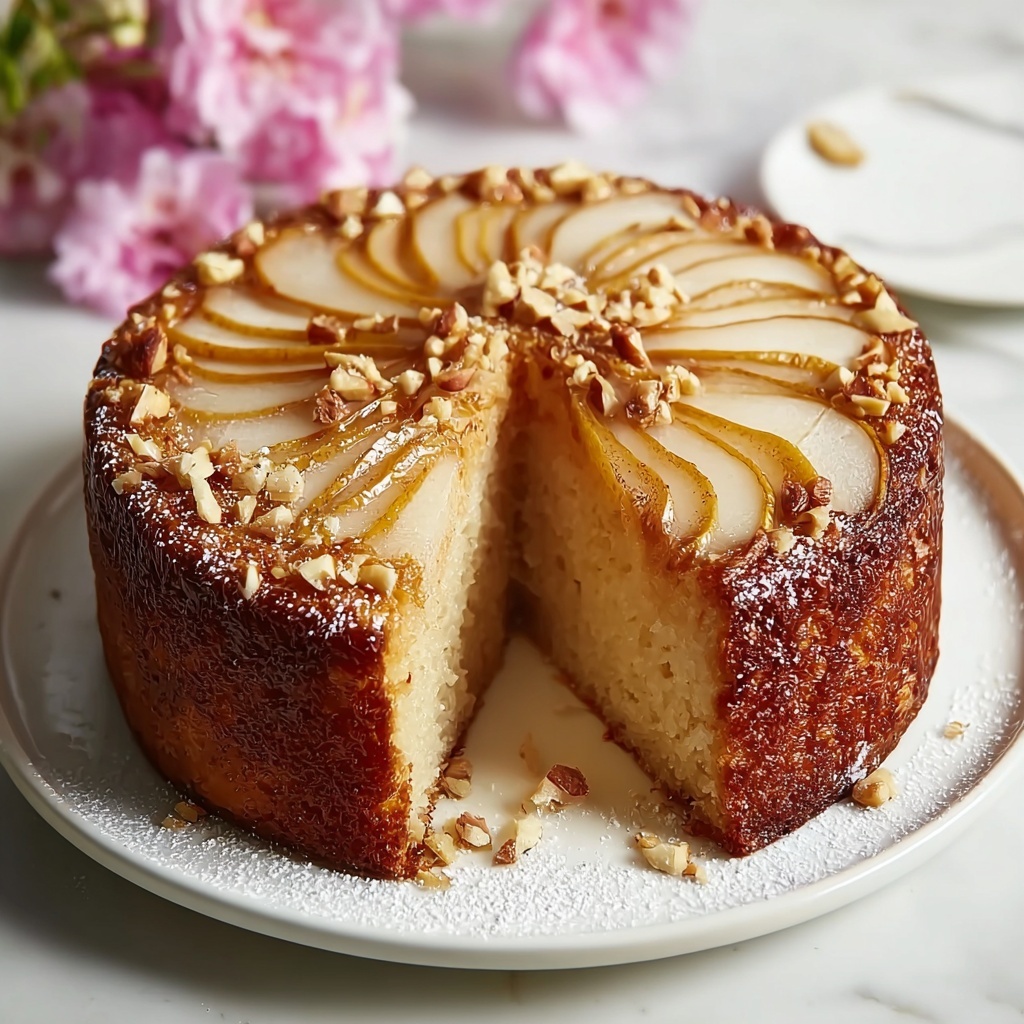 This cake pairs wonderfully with creamy accompaniments like a scoop of vanilla bean ice cream or freshly whipped cream. On cooler days, a warm cup of chai tea or lightly brewed coffee also harmonizes perfectly, highlighting the almond notes and juicy pears.