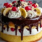 This Banana Split Cake is a rich and delightful dessert inspired by the classic banana split sundae. Featuring moist layers of vanilla cake filled with fresh bananas, strawberries, cherries, raspberries, and pineapple, all topped with luscious chocolate ganache, whipped cream swirls, and drizzles of hot fudge. Perfect for parties or any special occasion, it combines the favorite flavors of a banana split in a beautiful, sliceable cake.