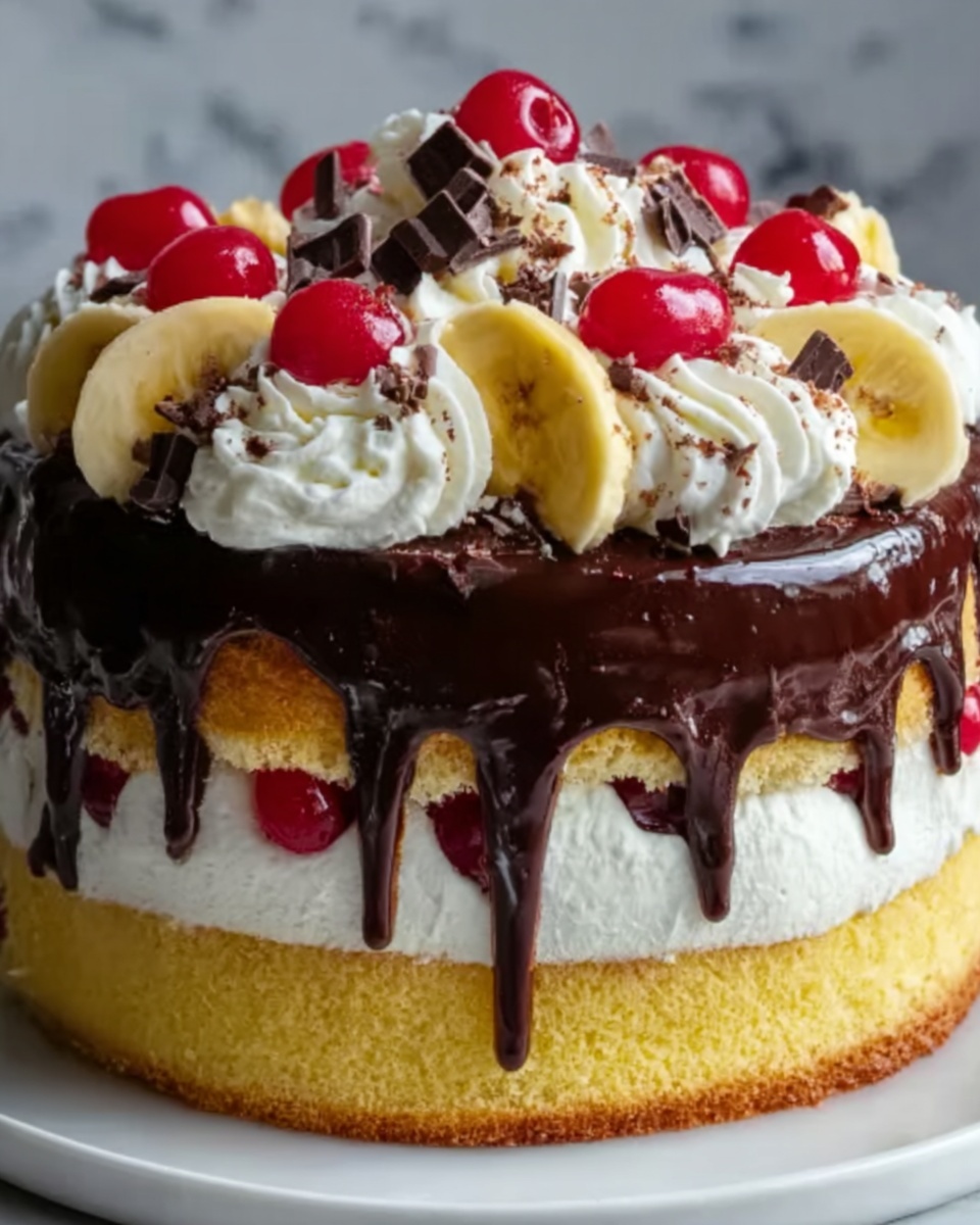 The garnishes for this cake are what bring it all together visually and flavor-wise. Fresh fruit slices like bananas, strawberries, and pineapple chunks bring brightness, while maraschino cherries add a pop of classic nostalgic color. Sprinkle chocolate chunks or shavings over the whipped cream for a delightful texture contrast, and finish with a drizzle of hot fudge to enrich every bite with chocolate decadence.