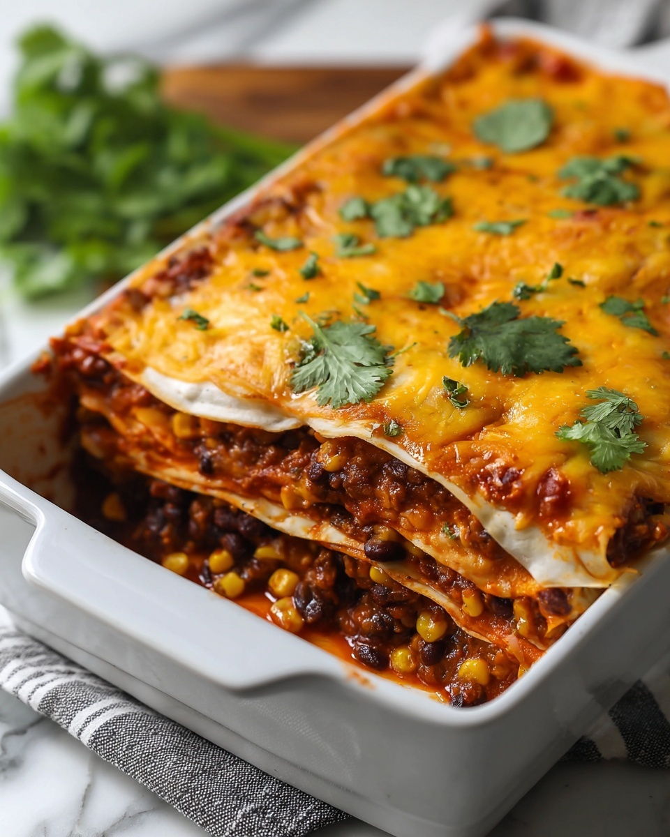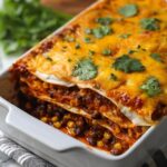 This Beef Enchilada Casserole with Corn Tortillas is a hearty and flavorful Mexican-inspired dish perfect for a family dinner. Layers of seasoned ground beef, black beans, corn, enchilada sauce, and melted cheese come together in a baked casserole that’s easy to prepare and satisfying to eat. Garnished with fresh cilantro, this dish delivers classic enchilada flavors in a convenient casserole form.