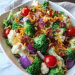 Grab a large mixing bowl and add your broccoli, cauliflower, thinly sliced red onion, halved cherry tomatoes, crispy crumbled bacon, shredded cheddar cheese, and sunflower seeds. Pour the dressing over everything and gently toss to coat every bite without crushing the veggies.