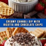 - Serve: When ready to serve, transfer the dip to a serving bowl. Top with additional chocolate chips, chopped pistachios, or crushed cannoli shells if desired. Serve with broken waffle cones, graham crackers, or fresh fruit for dipping.