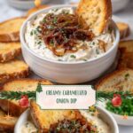 Sprinkle the reserved caramelized onions on top along with a few extra chopped chives to give a sophisticated, inviting look. The garnish adds a little texture and visual appeal, making your dip look as delicious as it tastes.