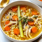 This Caribbean-Inspired Curry Chicken Soup is a hearty and flavorful dish featuring tender chicken thighs simmered in a fragrant curry-spiced broth with fresh vegetables and pearl couscous. Infused with Jamaican-style curry powder, turmeric, and aromatic herbs like thyme and bay leaf, this comforting soup delivers a perfect balance of warmth and spice, ideal for a satisfying lunch or dinner.