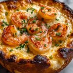 Cheesy Garlic Shrimp Bread Bowl is a decadent, creamy appetizer featuring succulent sautéed shrimp nestled inside a hollowed-out crusty bread boule, filled with a rich garlic cream sauce blended with melted mozzarella and Parmesan cheese. Perfect for sharing, this warm, gooey dish pairs the savory flavors of garlic and Italian seasoning with the delightful crunch of fresh bread, making it an irresistible treat for gatherings or cozy nights in.