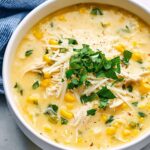 Serve the Chicken and Corn Chowder Recipe in rustic bowls with a sprinkle of chopped herbs on top for visual appeal. For a fun twist, try serving it inside hollowed-out bread bowls or alongside a variety of colorful, crunchy toppings like toasted pumpkin seeds or crispy bacon bits to add texture and visual interest.