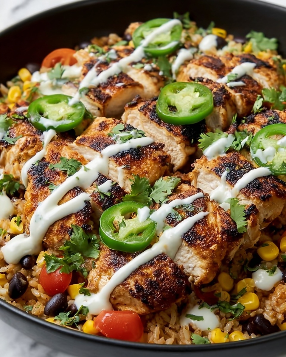 Once the rice is tender and the chicken is fully cooked, remove the chicken from the skillet. Stir in the remaining avocado oil, chopped cilantro, and fresh lime juice for that signature brightness and herbal lift. Serve the chicken over the bed of vibrant rice, and don’t forget to garnish with your favorite toppings for a truly irresistible meal.