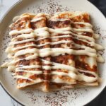 - Assemble: Spread the cinnamon filling evenly over each crepe, then roll them up tightly. Arrange the rolled crepes on a serving plate and drizzle the cream cheese topping generously over the top. Serve immediately to enjoy warm or at room temperature.