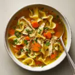 Classic Chicken Noodle Soup is a comforting and hearty homemade soup featuring tender shredded chicken, fresh vegetables, and egg noodles simmered in a flavorful chicken broth with herbs. Perfect for a cozy meal, this easy-to-make soup warms you up and satisfies with traditional American flavors.