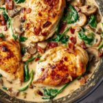 This Creamy Balsamic Spinach Bacon Mushroom Chicken recipe features tender chicken breasts cooked to golden perfection and smothered in a rich, creamy sauce infused with balsamic vinegar, crispy bacon, sautéed mushrooms, and fresh baby spinach. Ready in just 30 minutes, it’s a comforting, flavorful dish perfect for a weeknight dinner.