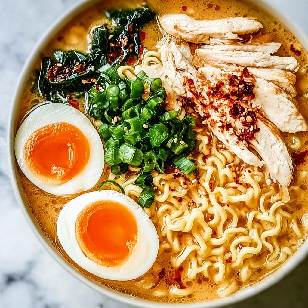Try serving the Creamy Garlic Chicken Ramen: A Cozy Bowl of Pure Comfort Recipe in individual large mugs for a fun, casual vibe. Layering ingredients so the chicken and garnishes sit on top creates a visually stunning bowl. Adding a swirl of chili oil provides dramatic color contrast and an exciting flavor boost. No matter how you plate it, this ramen is sure to look as good as it tastes.