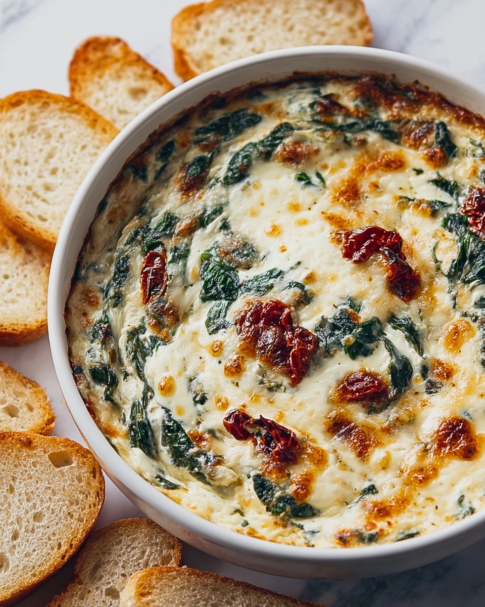 This creamy Tuscan dip is a rich and flavorful appetizer, blending cream cheese, sour cream, mozzarella, Parmesan, sun-dried tomatoes, and spinach with Italian seasonings. Perfectly baked until bubbly, it pairs beautifully with bread, baguette slices, or crackers for a delightful party starter or snack.