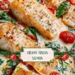 This Creamy Tuscan Salmon recipe features perfectly seared salmon fillets smothered in a rich, flavorful sauce made with garlic, cherry tomatoes, heavy cream, Parmesan cheese, spinach, and fresh basil. It’s a quick and elegant meal that combines Mediterranean flavors with creamy indulgence, perfect for a comforting dinner that can be paired with pasta, potatoes, rice, or enjoyed on its own with a salad.
