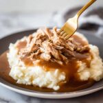 - Finish and Serve: After 5 hours, remove the lid and gently stir the chicken and gravy, breaking the chicken apart as you mix to create a shredded texture. Serve the chicken and gravy hot over mashed potatoes or rice for a hearty meal.