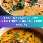 A flavorful and comforting Crockpot Thai Coconut Chicken Soup featuring tender chicken breasts simmered in a rich coconut milk broth infused with red curry paste, ginger, garlic, and fresh vegetables, finished with a splash of lime juice and fresh cilantro garnish.