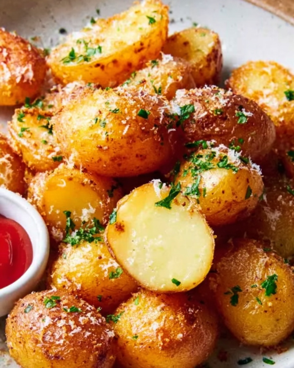 For an extra crunchy crust, use finely grated Parmesan and ensure the potatoes are well coated and spaced out on the baking sheet. Also, baking them cut-side down on the Parmesan bed maximizes contact and crisping.
