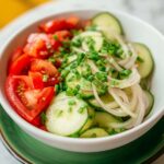 - Toss and Serve: Just before serving, drizzle the dressing over the salad and gently toss to coat the vegetables evenly. Taste and add additional salt if desired. Garnish with chopped green onions if using. Avoid dressing the salad early to prevent tomatoes from becoming too juicy.