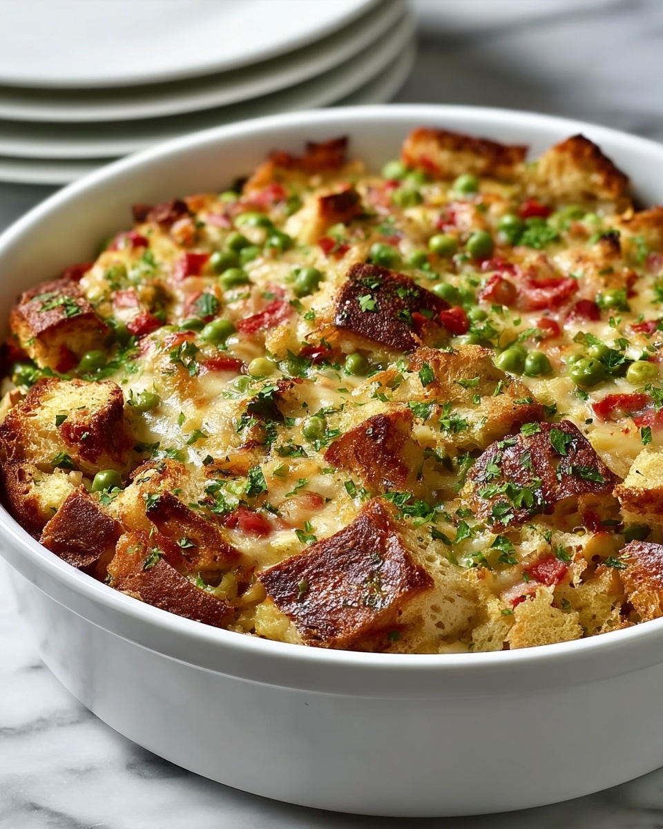 Transfer everything to the prepared casserole dish, spread it evenly, and bake for about 35 minutes. You’ll know it’s ready when the center is set and the top is lightly golden—perfect for slicing and serving.
