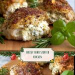 This Easy Cheesy Herb Stuffed Chicken Breasts recipe features juicy boneless chicken breasts filled with a flavorful mixture of Boursin cheese, feta or goat cheese, chopped toasted pecans, and fresh herbs. The chicken is oven-baked until golden and cooked perfectly, making it a delicious and simple dinner option that combines creamy, savory, and nutty flavors in every bite.