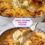 This Easy Southern Cheesy Scalloped Potatoes recipe features thinly sliced russet potatoes baked in a creamy, cheesy sauce made with sharp cheddar, Parmesan, and a hint of nutmeg and garlic. Creamy and comforting, these scalloped potatoes are the perfect side dish for family dinners or holiday meals.