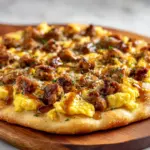 This English Muffin Breakfast Pizza is a quick and delicious morning meal featuring toasted English muffin halves topped with fluffy scrambled eggs, savory breakfast sausage or bacon, and a blend of melted cheddar and mozzarella cheeses. Enhanced with optional bell peppers and fresh green onions, this breakfast pizza offers a comforting and flavorful way to start your day.