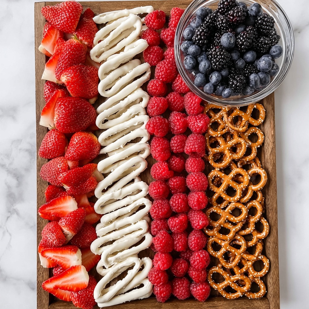 This vibrant and healthy Flag Fruit Tray is a visually striking and delicious snack perfect for patriotic celebrations or any colorful gathering. Featuring fresh berries arranged to mimic the American flag, paired with crunchy yogurt pretzels as stripes, this no-cook recipe offers a refreshing and nutritious treat that serves 8.