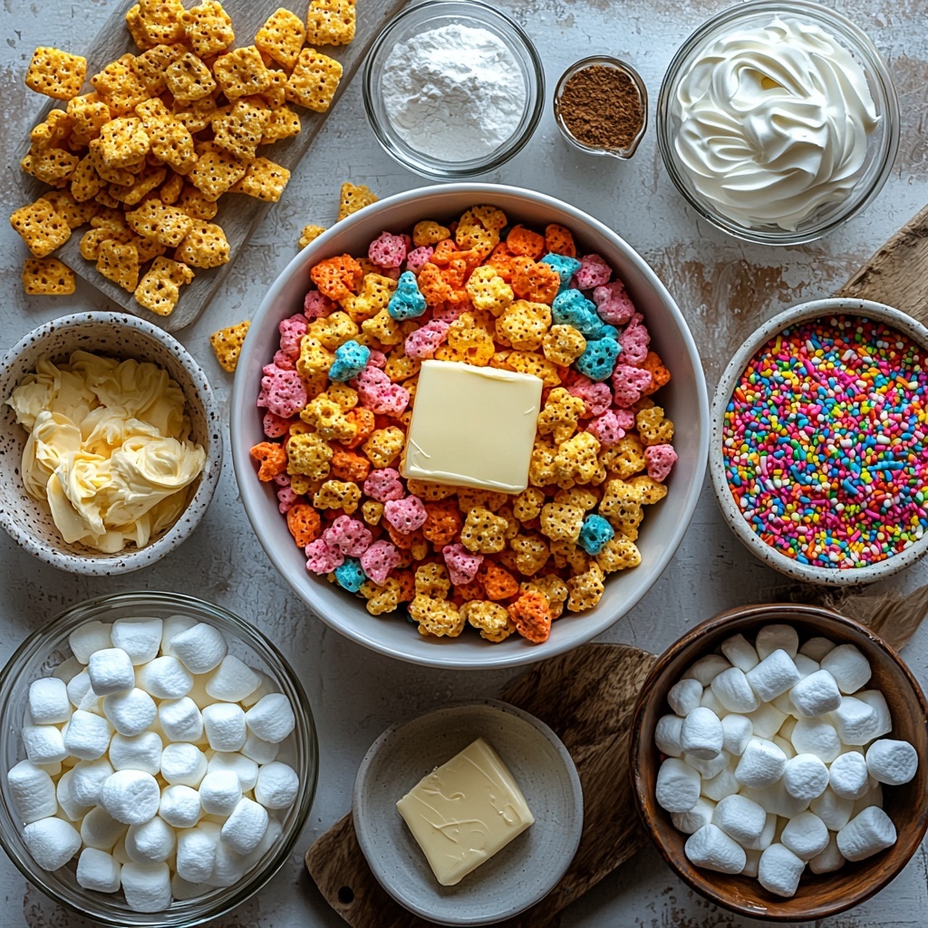 - 3 cups Fruity Pebbles cereal: The star of the show, adding a colorful, crispy base packed with fruity flavor.