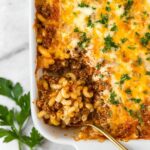 While the casserole is already packed with flavor, garnishing with a sprinkle of fresh parsley adds a bit of color and a pop of fresh herbaceousness that really brightens the dish. If you want to get a little more creative, a dollop of sour cream or a sprinkle of chopped green onions also pairs beautifully with the rich tomato and beef flavors.