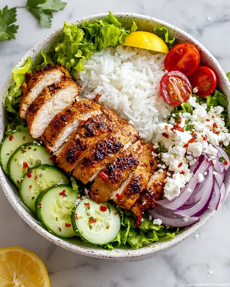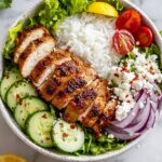 Start with a base of cooked rice or quinoa and layer on the halved tomatoes, diced cucumber, shredded romaine lettuce, sliced red onions, and a sprinkle of feta cheese. Slice the cooked chicken and place it right on top. Don’t forget to drizzle generously with your homemade tzatziki sauce to bring it all together.