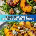 A fresh and vibrant Grilled Peach Salad featuring juicy grilled peaches, tangy gorgonzola cheese, crunchy toasted walnuts, and a sweet-tangy balsamic dressing, perfect for a light summer meal or starter.