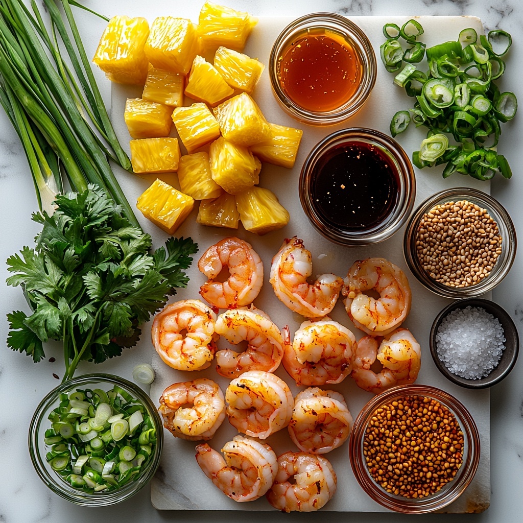 The magic of this Hawaiian Garlic Shrimp with a Sweet Twist Recipe lies in its simple but thoughtfully chosen ingredients. Each element plays a crucial role in building layers of flavor, adding texture, or enhancing the dish’s beautiful tropical character.