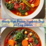 A hearty and nourishing high-protein vegetable soup packed with lentils, chickpeas, black beans, and a colorful array of fresh vegetables. This wholesome soup combines vibrant flavors and nutritious ingredients for a comforting and healthy meal perfect for any season.