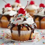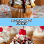 Delightful Ice Cream Sundae Cupcakes that combine the classic flavors of vanilla cake with creamy frosting, chocolate syrup, whipped cream, sprinkles, and a maraschino cherry topping, perfect for parties or a sweet treat.
