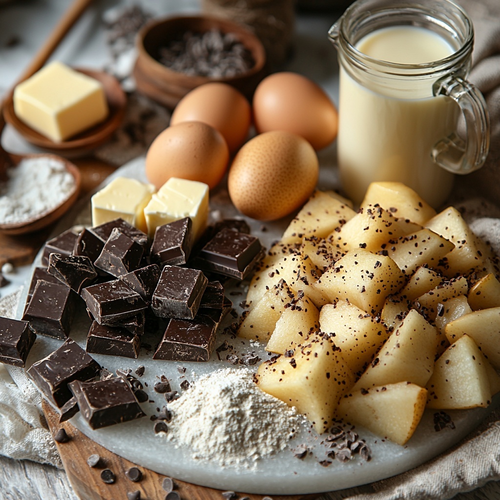 All the ingredients for this clafoutis are straightforward but essential—they each play a key role in creating that wonderful texture, richness, and flavor that make this dish unforgettable. From the fresh pears providing natural sweetness and freshness, to the dark chocolate giving it that deep indulgence, every component matters.