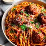 Gently toss everything together so the spaghetti gets coated in the delicious tomato sauce and the meatballs mingle with the pasta. Initially, the sauce may appear a little thin, but don’t worry—let it sit for a few minutes as it thickens beautifully on its own. Serve piping hot, and if you want to dress it up, sprinkle freshly grated Parmesan cheese and a handful of chopped fresh herbs like basil or parsley to add that bright, fresh finish.