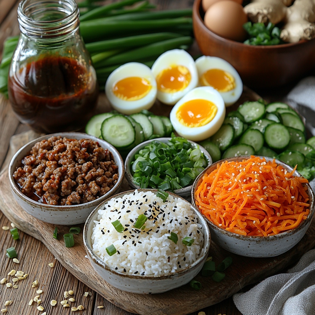 Build your bowl by spreading a generous layer of rice on the bottom, then pile on those luscious Korean BBQ meatballs. Surround with the shredded carrots, cabbage, and cucumber slices. Don’t forget to cut your soft-boiled eggs in half and place them on top. Finish with a sprinkle of sesame seeds and chopped green onions for that irresistible finishing touch.
