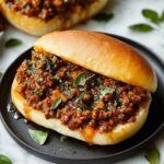 These Italian Garlic Bread Sloppy Joes offer a flavorful twist on the classic sloppy joe sandwich. Ground beef is simmered in a rich marinara-based sauce infused with garlic, herbs, and a hint of spice. The meat mixture is served on crispy, buttery sandwich rolls toasted in the oven with garlic and parmesan, delivering a comforting and savory meal perfect for lunch or dinner.