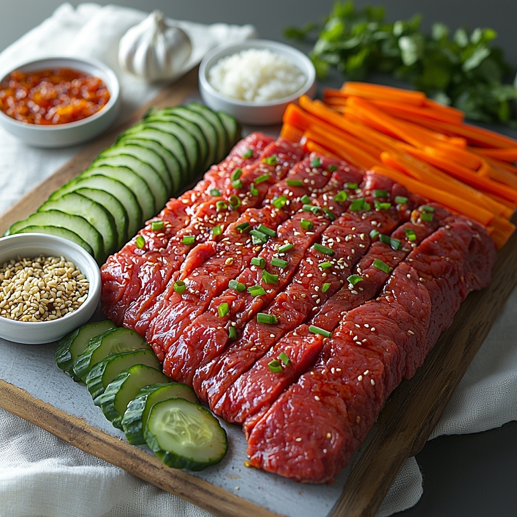 Start by combining the soy sauce, sesame oil, minced garlic, and gochujang in a bowl to create a flavorful marinade. This mixture penetrates the flank steak beautifully, making every bite juicy and packed with that signature Korean BBQ flavor. Let the steak soak up these flavors for at least 30 minutes—this is a crucial step to get that tender, spicy kick.