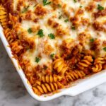 Pour the entire mixture into a greased 9×13-inch casserole dish, spreading it out evenly. Then sprinkle shredded mozzarella cheese over the top in a generous layer. Bake the casserole for about 20 minutes or until the cheese turns golden and bubbles up invitingly. The result is a hot, cheesy, and meaty casserole that’s irresistible straight from the oven.