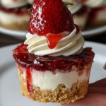 These Mini Strawberry Cheesecake Cupcakes are a delightful handheld dessert featuring a buttery graham cracker crust, creamy strawberry-infused cheesecake filling, and a fresh strawberry compote topping. Perfect for parties or a sweet treat, these individual cheesecakes combine luscious cream cheese with bursts of fresh strawberry flavor, baked to perfection in a convenient cupcake form.