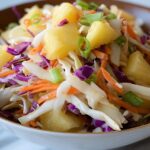 Now, in a spacious mixing bowl, toss together the shredded green cabbage, purple cabbage, carrots, pineapple chunks, and red onion. Pour the dressing over the top and toss gently but thoroughly to ensure every piece is evenly coated with that vibrant, zingy dressing. This step truly brings the salad together into one harmonious flavor experience.