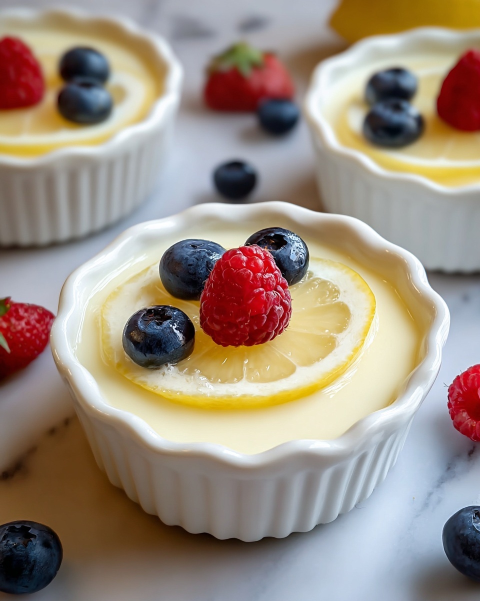 Divide the lemon cream mixture among your serving dishes, filling each about three-quarters full to allow room for setting and garnishes.