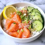 - Assemble the Bowl: Arrange the salmon slices artfully in a serving bowl, slightly overlapping them. Add cucumber slices, then sprinkle with sesame seeds, chopped chives, and thinly sliced red onion for color and crunch.