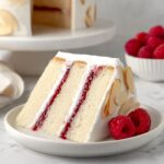 Cover the cake generously with your buttercream, smoothing the sides with a cake scraper. For an elegant yet rustic look, leave a raw edge on top if you like. Finish by decorating with fresh raspberries and slivered almonds for a stunning presentation and delightful textures.