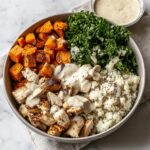 A wholesome and flavorful Roasted Chicken, Sweet Potato, and Kale Bowl featuring perfectly seasoned roasted sweet potatoes and chicken, tender massaged kale, fluffy brown rice, creamy avocado, tangy feta, and a zesty chipotle yogurt sauce. This vibrant bowl is ideal for a nutritious, satisfying meal packed with protein, fiber, and fresh ingredients.