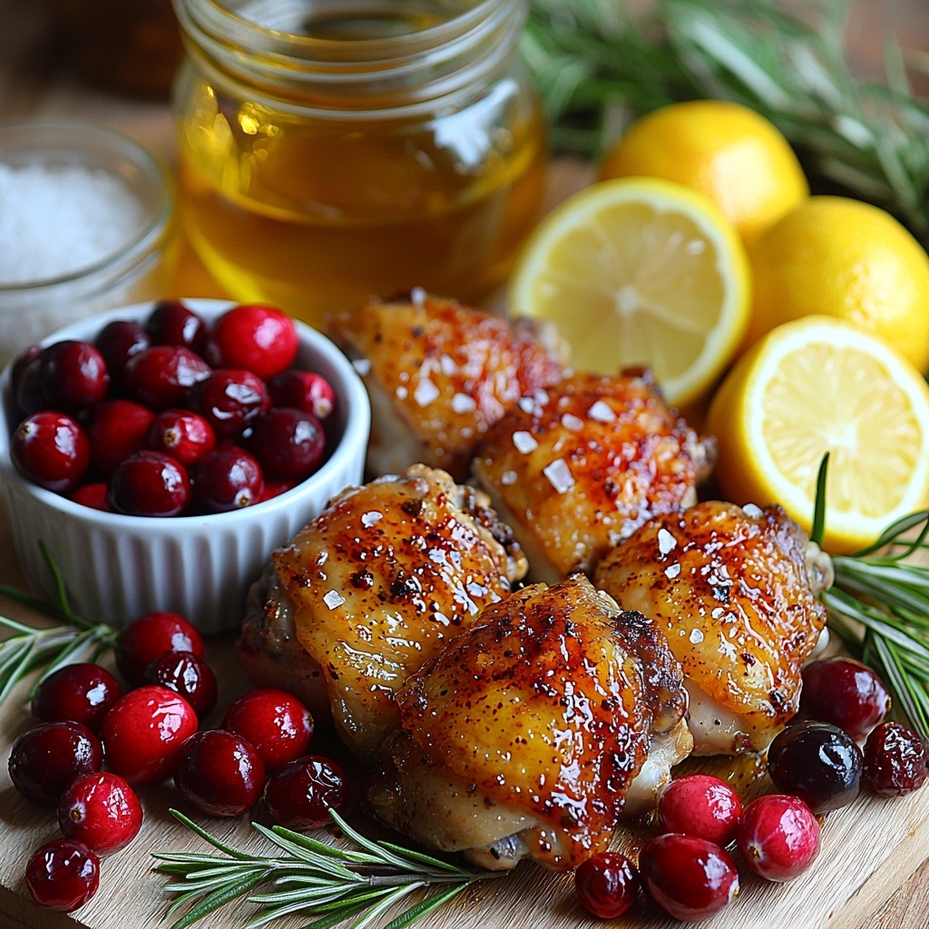 Delicious and juicy roasted chicken thighs baked with a vibrant and tangy cranberry sauce, infused with garlic, rosemary, and lemon for a perfect balance of savory and sweet flavors. This easy-to-make dish highlights tender chicken skin crisped in the oven complemented by fresh cranberries and aromatic herbs.