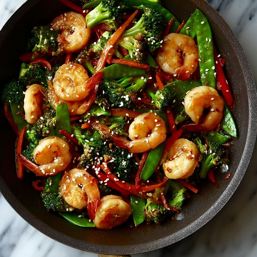 Fresh garnishes can elevate this stir fry to something extra special. Try sprinkling chopped green onions, toasted sesame seeds, or even a handful of chopped fresh cilantro for pops of color and hints of brightness that complement the shrimp and veggies beautifully.