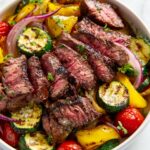 This Sizzling Steak with Roasted Veggies recipe features tender, thinly sliced sirloin steak paired with vibrant roasted zucchini, yellow squash, tomatoes, and red onion. Seasoned with a blend of garlic, oregano, and crushed red pepper flakes, and cooked with olive oil and coconut aminos for a savory, slightly spicy flavor balance, this dish is a quick and flavorful meal perfect for any weeknight. Ready in just 30 minutes, it’s a wholesome combination of protein and roasted vegetables that will satisfy your appetite and nourish your body.