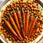 - Assemble the Dish: Spread a generous layer of yogurt sauce on a serving plate. Arrange the roasted carrots on top. Drizzle extra yogurt sauce over the carrots, then scatter the crispy chickpeas around.