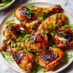 This Sticky Korean Chicken recipe features tender, juicy chicken legs and thighs marinated in a flavorful blend of honey, soy sauce, garlic, ginger, and red chili flakes. The chicken is oven-baked to perfection until the skin is caramelized and slightly blistered, then garnished with fresh green onions and toasted sesame seeds for an irresistible, authentic Korean-inspired dish.